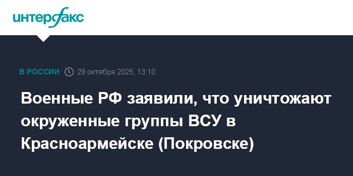 Москва. 29 октября. INTERFAX.RU - Российские войска продолжают уничтожение окруженных групп армии Украины в Красноармейске (Покровске) и закрепляются в его промзоне, проводят зачистку Гнатовки, заявило Минобороны РФ в среду.