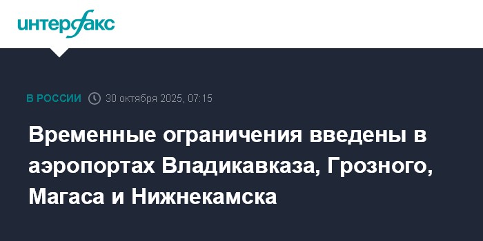 "Аэропорты Владикавказ (Беслан), Грозный (Северный), Магас, Нижнекамск (Бегишево). Введены временные ограничения на прием и выпуск воздушных судов", - написал он в четверг в своем телеграм-канале.