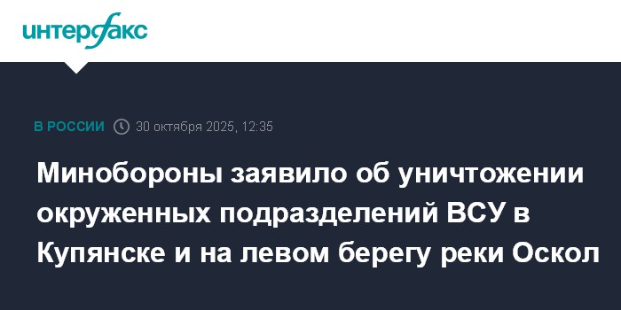 Москва. 30 октября. INTERFAX.RU - Российские военнослужащие ведут уничтожение окруженных подразделений вооруженных сил Украины (ВСУ) в Купянске и на левом берегу реки Оскол, пресечены две украинские попытки провести контратаки со стороны Петровки Харьковской области, заявили в Минобороны России в четверг.