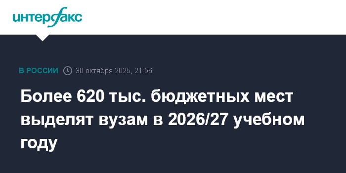 Москва. 30 октября. INTERFAX.RU - Минобрнауки России выделит вузам в 2026/2027 учебном году 620,5 тыс. бюджетных мест, сохранив показатель на уровне прошлого года, число бюджетных мест по инженерным и сельскохозяйственным направлениям планируется увеличить, сообщили в правительстве РФ.
