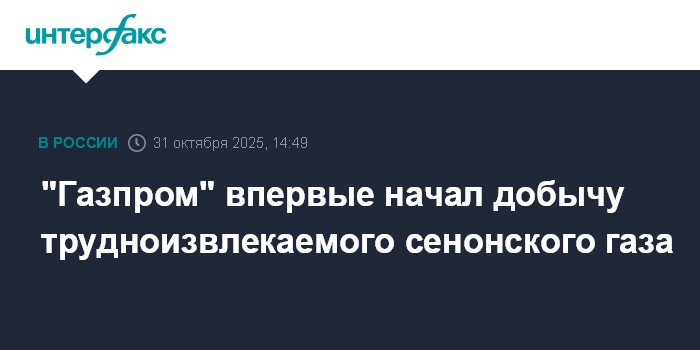 Москва. 31 октября. INTERFAX.RU - "Газпром" в режиме опытно-промышленной эксплуатации начал добычу трудноизвлекаемного сенонского газа (располагается выше основного продуктивного сеноманского горизонта) на Медвежьем месторождении, сообщила корпоративная газета ООО "Газпром добыча Надым".