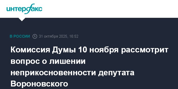 "31 октября в Госдуму поступило представление генпрокурора Александра Гуцана о даче согласия на лишение неприкосновенности депутата Вороновского. Материалы приняты комиссией для рассмотрения по существу. Комиссия в соответствии с регламентом соберется 10 ноября и определится с решением, которое будет вынесено на утверждение палаты", - сказал Аршба журналистам.