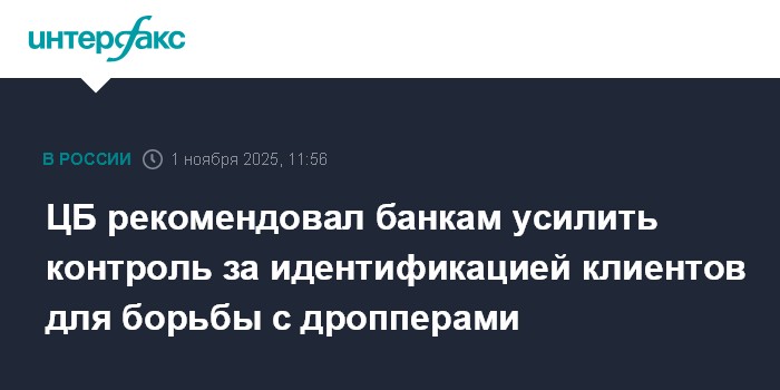 Москва. 1 ноября. INTERFAX.RU - ЦБ РФ рекомендовал банкам усилить контроль за процедурой идентификации клиентов для борьбы с дропперами, соответствующее письмо опубликовано на сайте регулятора.