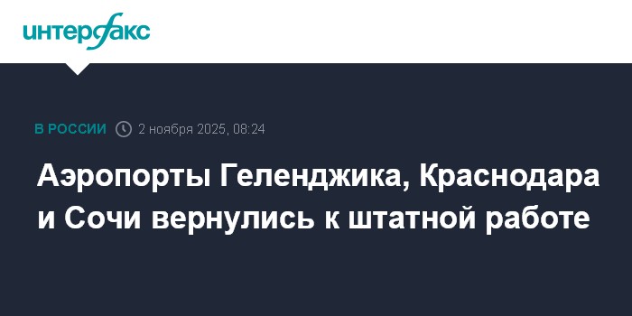 Москва. 2 ноября. INTERFAX.RU - Временные ограничения на прием и выпуск самолетов сняты в аэропортах Геленджика, Краснодара и Сочи, сообщил представитель Росавиации Артем Кореняко.