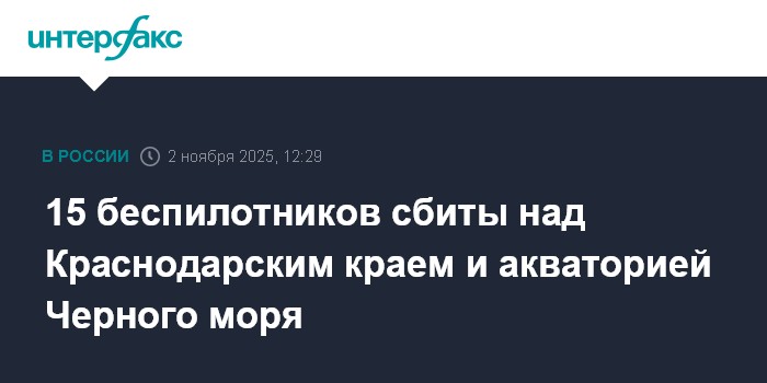 Москва. 2 ноября. INTERFAX.RU - Российские средства ПВО с 9:00 до 12:00 воскресенья уничтожили 15 украинских БПЛА самолетного типа: 14 - над территорией Краснодарского края и один - над акваторией Черного моря, сообщает Минобороны РФ.