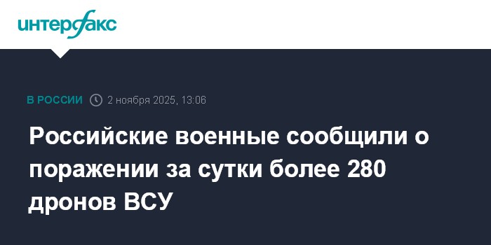 Москва. 2 ноября. INTERFAX.RU - Минобороны РФ сообщило, что за сутки средства противовоздушной обороны нейтрализовали более 290 различных воздушных целей.