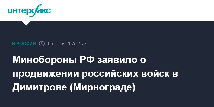 Минобороны РФ заявило о продвижении российских войск в Димитрове (Мирнограде)