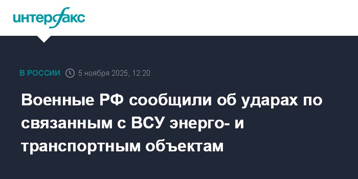 Москва. 5 ноября. INTERFAX.RU - Вооружённые силы России нанесли удары по связанным с украинской армией энергетическим и транспортным объектам, сообщило министерство обороны РФ в среду.