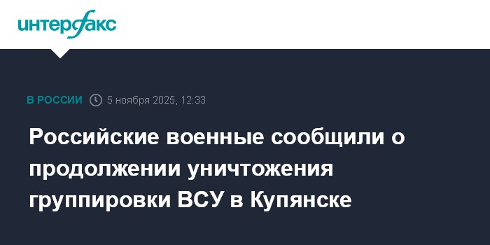 Москва. 5 ноября. INTERFAX.RU - Российская армия ведет уничтожение окруженной группировки ВСУ в Купянске, сорвано несколько украинских контратак, сообщило Минобороны РФ в среду.