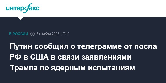 Путин сообщил о телеграмме от посла РФ в США в связи заявлениями Трампа по ядерным испытаниям
