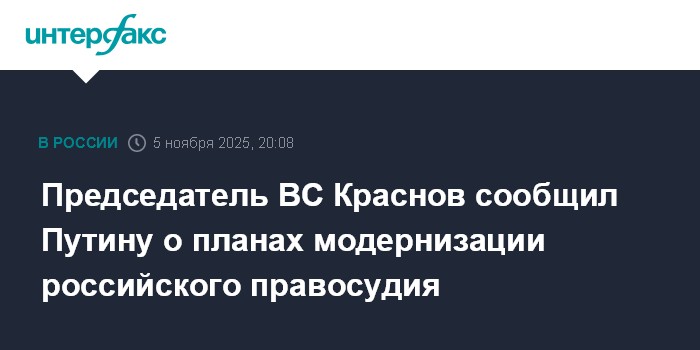 Москва. 5 ноября. INTERFAX.RU - Председатель Верховного суда РФ Игорь Краснов сообщил президенту Владимиру Путину о подготовке мер, направленных на модернизацию российского правосудия и судопроизводства в стране.