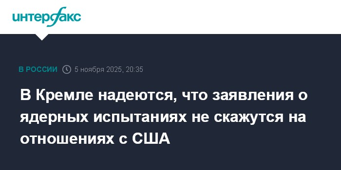 Москва. 5 ноября. INTERFAX.RU - В Кремле надеются, что ситуация вокруг заявлений о возможности ядерных испытаний не окажет влияние на отношения России и США, заявил пресс-секретарь президента РФ Дмитрий Песков.