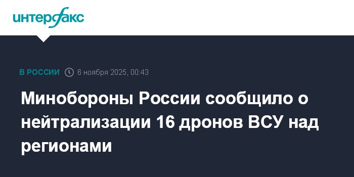 Москва. 6 ноября. INTERFAX.RU - Минобороны РФ сообщило, что 16 украинских беспилотников перехвачены и уничтожены российскими военными с 17:00 мск среды до полуночи.