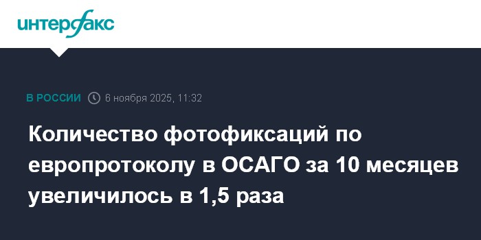 Москва. 6 ноября. INTERFAX.RU - Количество фотофиксаций по европротоколу в ОСАГО в связи с ДТП за 10 месяцев 2025 года увеличилось в 1,5 раза по сравнению с тем же периодом 2024 года, сообщает Российский союз автостраховщиков (РСА).