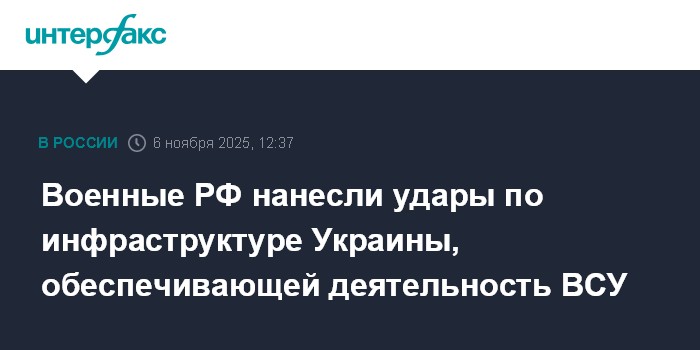Москва. 6 ноября. INTERFAX.RU - Вооружённые силы России нанесли удары по объектам энергетической и транспортной инфраструктуры Украины, обеспечивающим деятельность ВСУ, сообщило министерство обороны РФ в четверг.