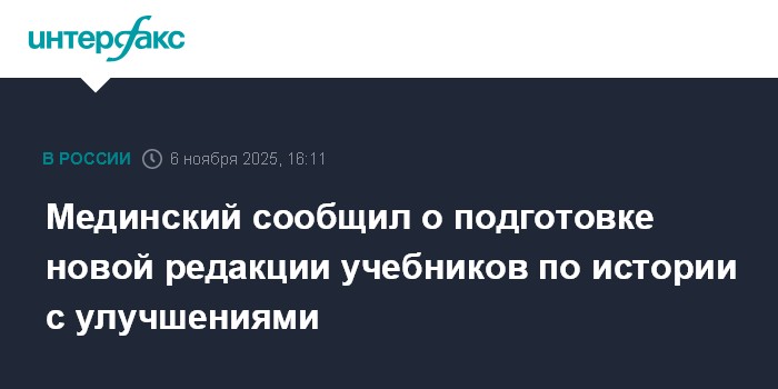 Москва. 6 ноября. INTERFAX.RU - Готовится дополнительная редакция единых учебников по истории для 5-11-х классов с исправлениями и улучшениями, сообщил помощник президента РФ Владимир Мединский на открытии Всероссийского совещания деканов и заведующих кафедрами исторических факультетов вузов России. Об этом сообщает пресс-служба Российского военно-исторического общества.