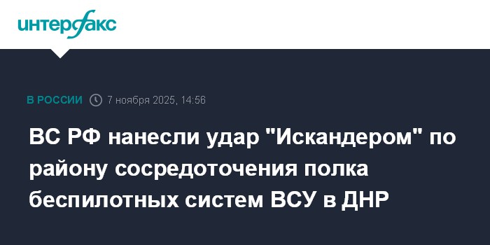 Москва. 7 ноября. INTERFAX.RU - Расчёт оперативно-тактического ракетного комплекса "Искандер-М" нанёс удар по району сосредоточения личного состава, вооружения и военной техники 411-го отдельного полка беспилотных систем ВСУ в районе села Варваровка (ДНР) на краматорско-дружковском направлении СВО, сообщает министерство обороны РФ.