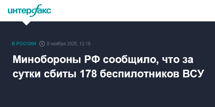 Москва. 8 ноября. INTERFAX.RU - Российские средства ПВО за минувшие сутки сбили 178 украинских БПЛА самолетного типа, сообщает в субботу Минобороны РФ.