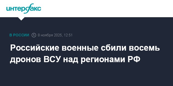 Москва. 8 ноября. INTERFAX.RU - Восемь украинских беспилотников уничтожены в субботу с 9:00 до 12:00 над российскими регионами, сообщило Минобороны РФ.