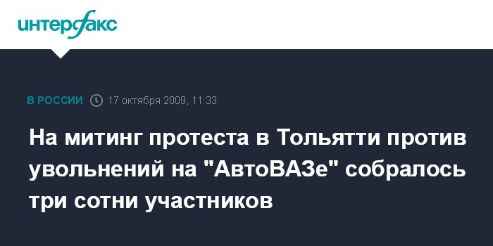 Москва. 17 октября. INTERFAX.RU - Порядка 250-300 человек собрались на митинг протеста против увольнений на "АвтоВАЗе", организованный профсоюзом "Единство" - независимым профсоюзным органом предприятия, передает корреспондент "Интерфакса".