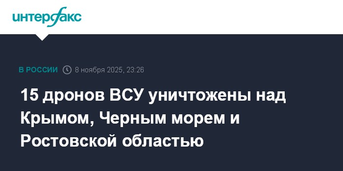 Москва. 8 ноября. INTERFAX.RU - Пятнадцать украинских беспилотников самолетного типа сбиты в субботу вечером дежурными средствами ПВО, сообщило Минобороны РФ.