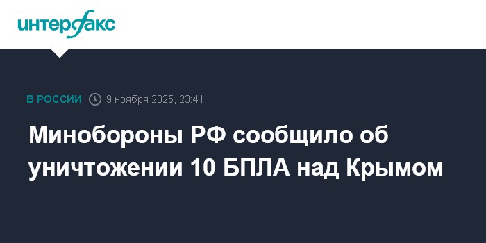 Москва. 9 ноября. INTERFAX.RU - Минобороны РФ заявило, что с 20:00 до 23:00 дежурными средствами ПВО уничтожены 10 украинских беспилотников самолетного типа над Крымом.