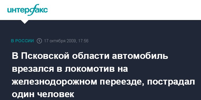 Москва. 17 октября. INTERFAX.RU - В Псковской области на перегоне Березки-Псков-Санкт-Петербург в субботу утром произошло ДТП на железнодорожном переезде.