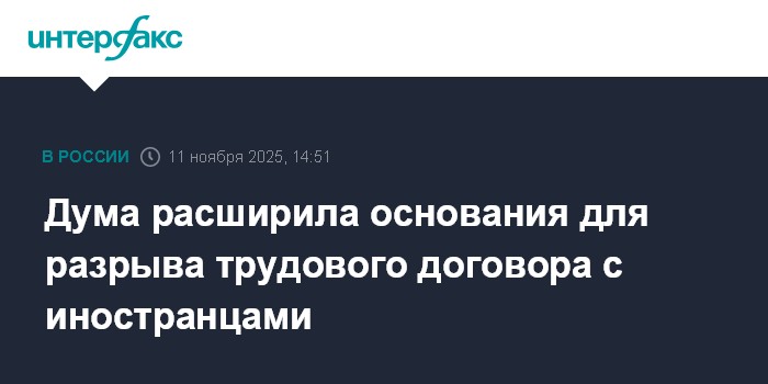 Москва. 11 ноября. INTERFAX.RU - Госдума приняла во втором и в третьем чтении закон, который дополняет перечень оснований для прекращения трудового договора с иностранным гражданином и лицом без гражданства. Эту инициативу внесли в парламент депутаты от фракции "Новые люди".