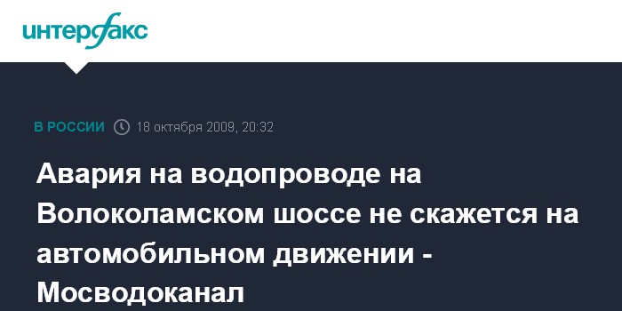 Авария на водопроводе на Волоколамском шоссе не скажется на автомобильном движении - Мосводоканал