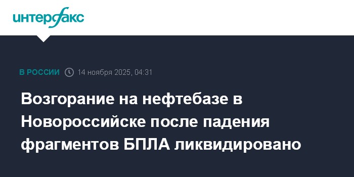 Москва. 14 ноября. INTERFAX.RU - Возгорание на нефтебазе в Новороссийске, возникшее из-за падения фрагментов БПЛА, ликвидировано, сообщается в телеграм-канале оперативного штаба Краснодарского края.