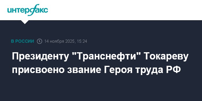 Москва. 14 ноября. INTERFAX.RU - Президент России Владимир Путин своим указом присвоил президенту ПАО "Транснефть" Николаю Токареву звание Героя труда РФ.