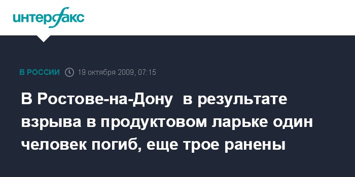 Москва. 19 октября. ИНТЕРФАКС - Один человек погиб и еще трое пострадали в результате взрыва в продуктовом ларьке в городе Ростов-на-Дону.