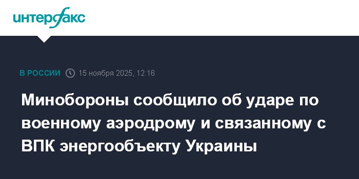 Москва. 15 ноября. INTERFAX.RU - Российские военные нанесли удар по украинскому военному аэродрому и по энергообъекту, связанному с военно-промышленным комплексом Украины, заявило Минобороны РФ в субботу.