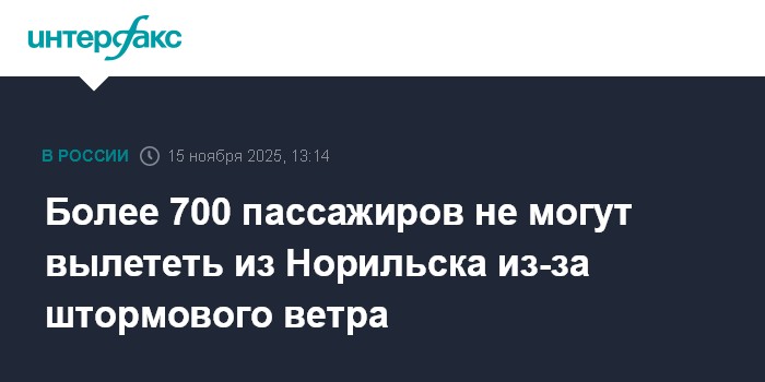 Москва. 15 ноября. INTERFAX.RU - Задержки рейсов объявлены из-за непогоды в международном аэропорту Норильск имени Н. Урванцева, где ожидают вылета более семьсот человек, сообщает пресс-служба транспортной полиции Сибири в своем телеграм-канале.