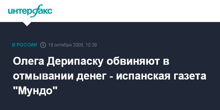 Москва. 19 октября. INTERFAX.RU - Испанское правосудие подозревает российского миллиардера Олега Дерипаску в возможных связей с "российской мафией", пишет испанская газета "Мундо". По данным неназванных источников "Мундо", существуют указания на то, что "алюминиевый король" участвовал в отмывании более 4 млн евро в период 2001-2004 гг.