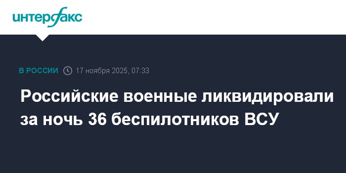 Москва. 17 ноября. INTERFAX.RU - Российские военные перехватили и уничтожили 36 украинских беспилотников над регионами РФ с 23:00 до 7:00 мск, сообщили в Минобороны России.