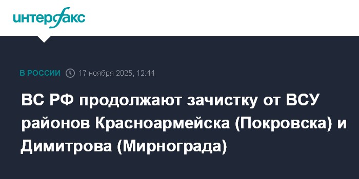 ВС РФ продолжают зачистку от ВСУ районов Красноармейска (Покровска) и Димитрова (Мирнограда)