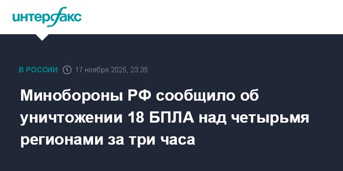 Москва. 17 ноября. INTERFAX.RU - Над четырьмя регионами России вечером 17 ноября за три часа были уничтожены 18 украинских БПЛА, сообщили в министерстве обороны РФ.
