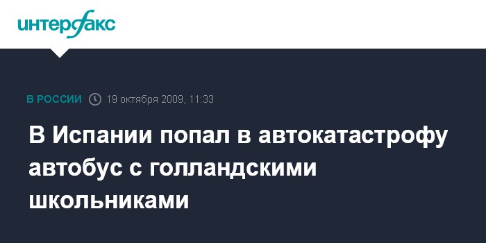 Москва. 19 октября. INTERFAX.RU - Одна голландская школьница погибла, еще 25 ее сверстников получили ранения и травмы в понедельник в результате крушения автобуса на автотрассе близ испанского города Жироны, сообщает агентство ЭФЭ.