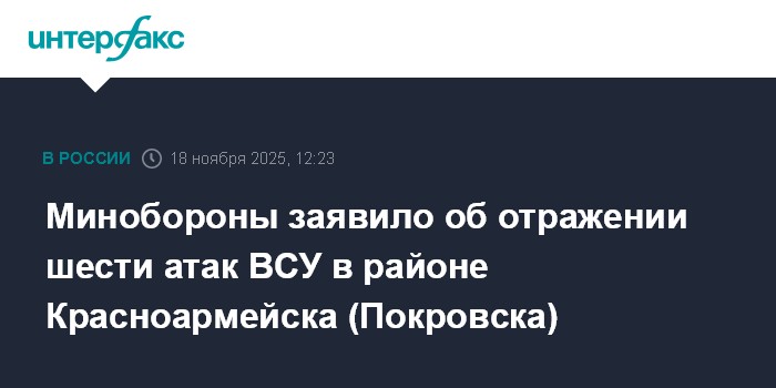 Москва. 18 ноября. INTERFAX.RU - Российские военнослужащие в течение суток отразили шесть украинских атак в районе Красноармейска (Покровска), в Димитрове продолжаются наступательные действия, заявили в Минобороны России во вторник.