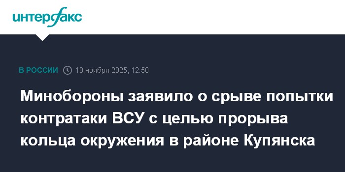 Москва. 18 ноября. INTERFAX.RU - Российские военные ведут уничтожение окруженных украинских подразделений в Купянске, за минувшие сутки сорвана попытка контратаки ВСУ с целью прорыва кольца окружения, сообщили в Минобороны РФ во вторник.