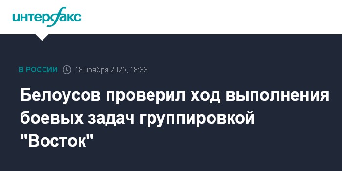 Москва. 18 ноября. INTERFAX.RU - Министр обороны РФ Андрей Белоусов проверил ход выполнения боевых задач соединениями и воинскими частями группировки войск "Восток" в зоне проведения СВО, сообщило военное ведомство.
