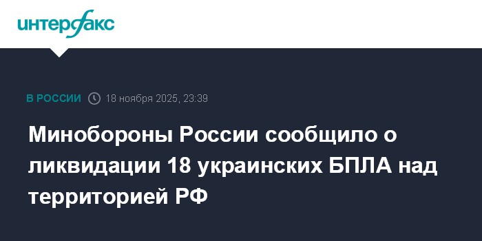 Минобороны России сообщило о ликвидации 18 украинских БПЛА над территорией РФ