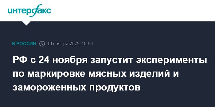 Москва. 19 ноября. INTERFAX.RU - Правительство РФ одобрило проведение с 24 ноября 2025 года экспериментов по маркировке в системе "Честный знак" мясных изделий, а также полуфабрикатов и замороженной пищевой продукции.