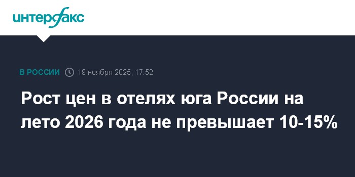 "Рост цен в отелях на южных курортах России на предстоящий летний сезон оказался сдержаннее по сравнению с предыдущим сезоном. Часть объектов сохранила тарифы 2025 года, другие подняли цены лишь на 5-10%, а некоторые, у кого все хорошо с загрузкой, - на 15-20%. Средний рост по большинству направлений составляет 10-15%, констатируют в компаниях Coral Travel и "Мультитур". По данным туроператора "Алеан", большинство отелей Анапы сохранили цены на уровне прошлого года", - говорится в сообщении.