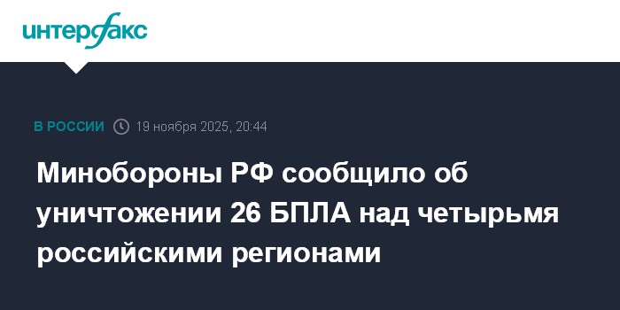 Минобороны РФ сообщило об уничтожении 26 БПЛА над четырьмя российскими регионами