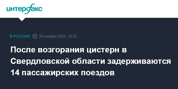 Москва. 20 ноября. INTERFAX.RU - Задержка ряда пассажирских поездов произошла из-за возгорания цистерн с газовым конденсатом в Свердловской области, продолжаются работы по восстановлению движения, сообщает пресс-служба Свердловской железной дороги.