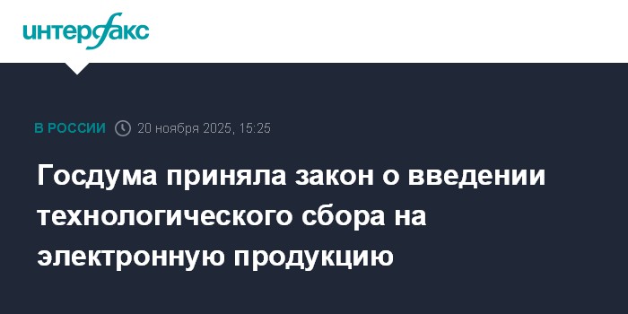 Москва. 20 ноября. INTERFAX.RU - Госдума приняла в третьем, окончательном чтении закон о введении с 1 сентября 2026 г. технологического сбора за импорт и производство продукции с электронной компонентной базой. Соответствующие изменения вносятся в закон "О промышленной политике в РФ".