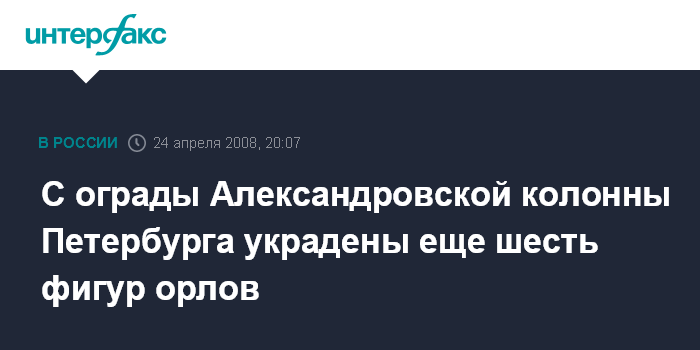 Санкт-Петербург. 24 апреля. INTERFAX.RU - С ограды Александровской колонны на Дворцовой площади Петербурга пропали еще шесть металлических орлов, сообщил "Интерфаксу" в четверг источник в правоохранительных органах города.