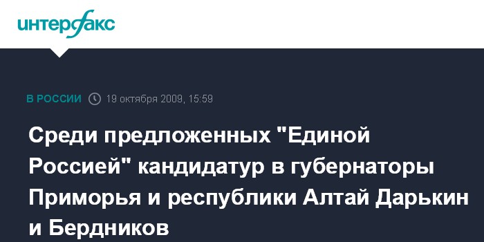 Москва. 19 октября. INTERFAX.RU - "Единая Россия" представила президенту РФ Дмитрию Медведеву кандидатуры на пост губернаторов Приморского и республики Алтай.